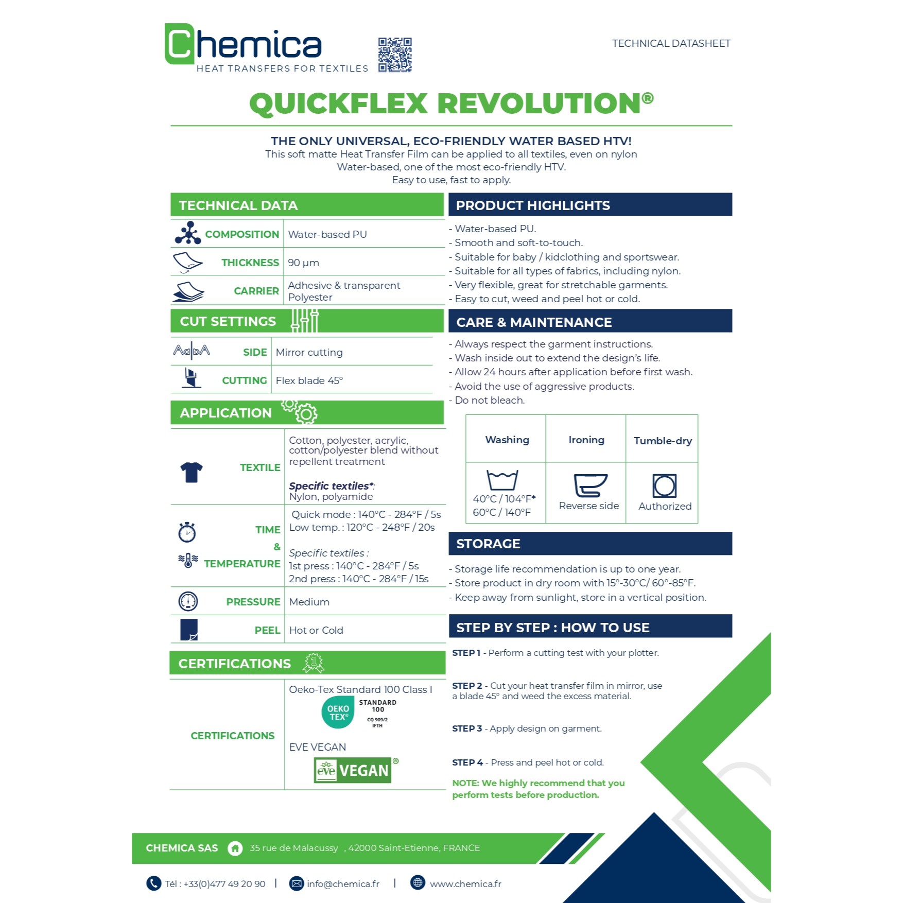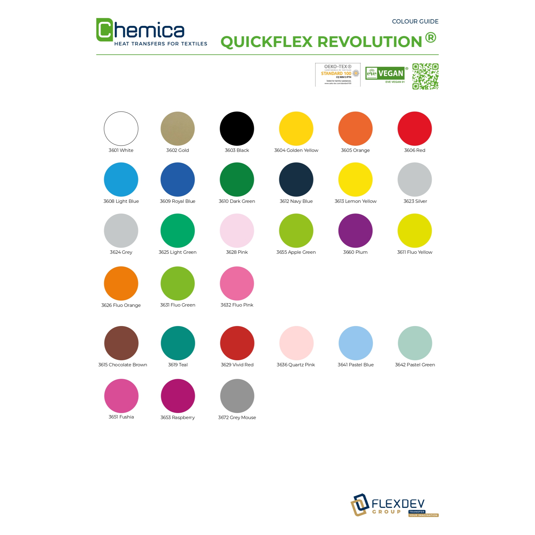 Quickflex Revolution – tas ir jaunās paaudzes termo plēve, kas izstrādāta, izmantojot ūdens bāzē izgatavotu poliuretānu (PU) materiālu. Šis pārklājums izceļas ar savu ekoloģisko raksturu, jo tā ražošanas procesā netiek izmantoti šķīdinātāji, un gala pārklājums ir 100% matēts, ar ļoti mīkstu virsmu, kas atgādina “persikų oda” The translation of “(persiko odos) efektą” from Lithuanian to Latvian is “(persiku ādas) efektu”. Savas plānuma un elastīguma dēļ tam lieliski piemērojas gan parastiem, gan elastīgiem apģērbiem, piemēram, sporta apģērbiem vai bērnu apģērbiem.
