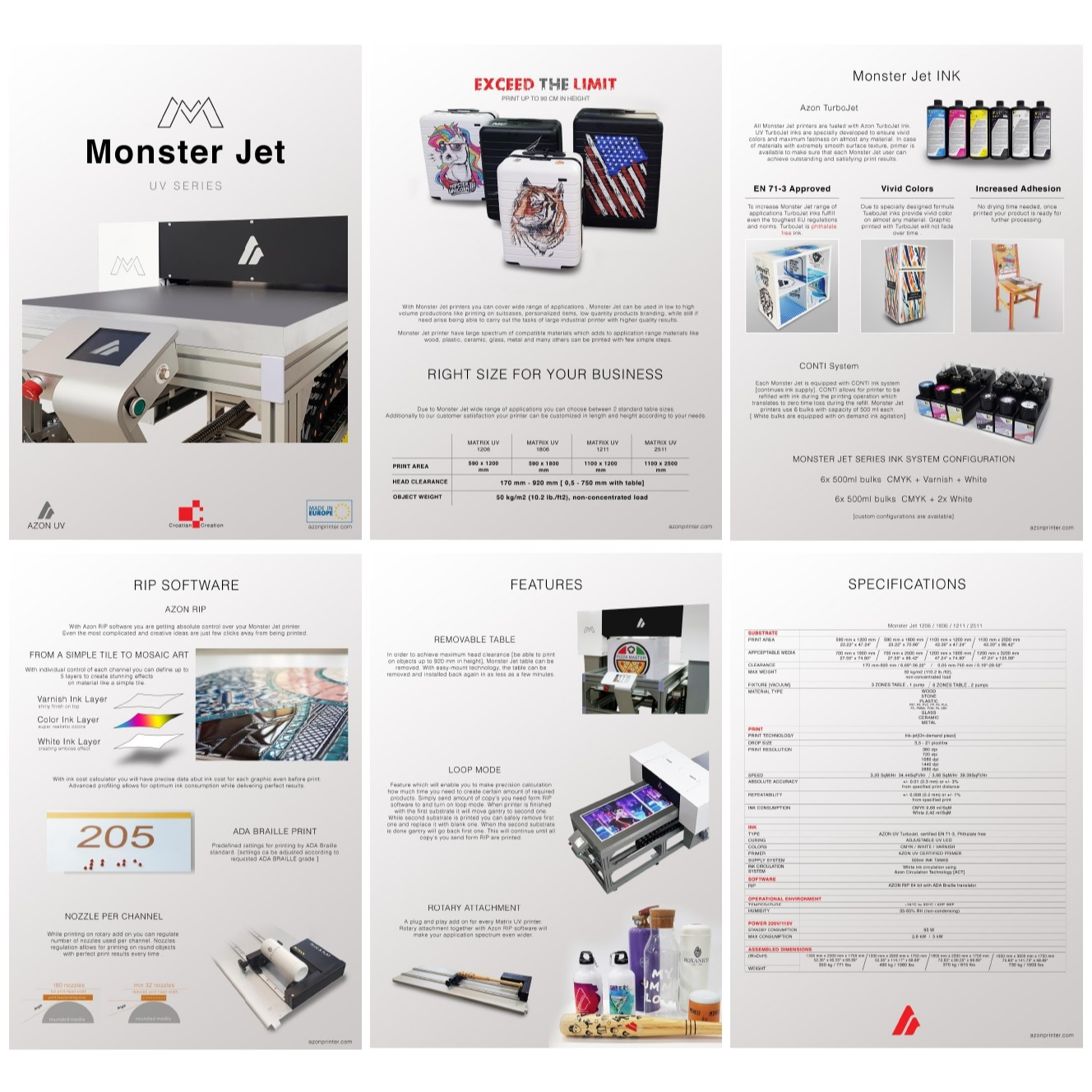 Azon Matrix MonsterJet ir unikāls produkts tirgū, un vienīgais savā klasē, kas var drukāt uz priekšmetiem līdz pat gandrīz 1 metra augstumam Kā arī citi UV Azon printeri ietver četras dažādas drukāšanas platības (no 120×60 cm līdz 110×250 cm) Zināms, bez ierastās CMYK+W konfigurācijas, tā nodrošina spīdīgu apdares efektu, kas arī var pārvērsties matētā, atkarībā no tā, kā UV lampa tiek izmantota, lai pabeigtu druku