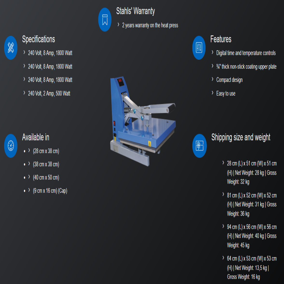 Ekonomiskās klases termospieds; Laba cena – lieliski piemērots sākuma biznesam; Vienkārši lietojams; Digitāls laika un temperatūras rādījums